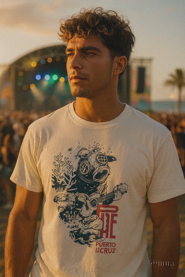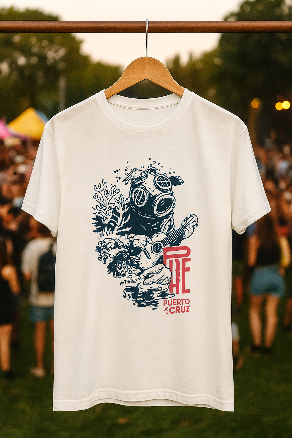 La camiseta más profunda de Phe Festival. Un diseño de Ivan Retamas inspirado en el mar y en la tradición Cousteau. Como se puede apreciar en los infinitos detalles y trazos, ilustra un buzo que convierte en escenario musical el fondo del océano. Un prenda de autor, lo tiene todo: una estampación única, un algodón suave, la inspiración de la brisa en Puerto de la Cruz.