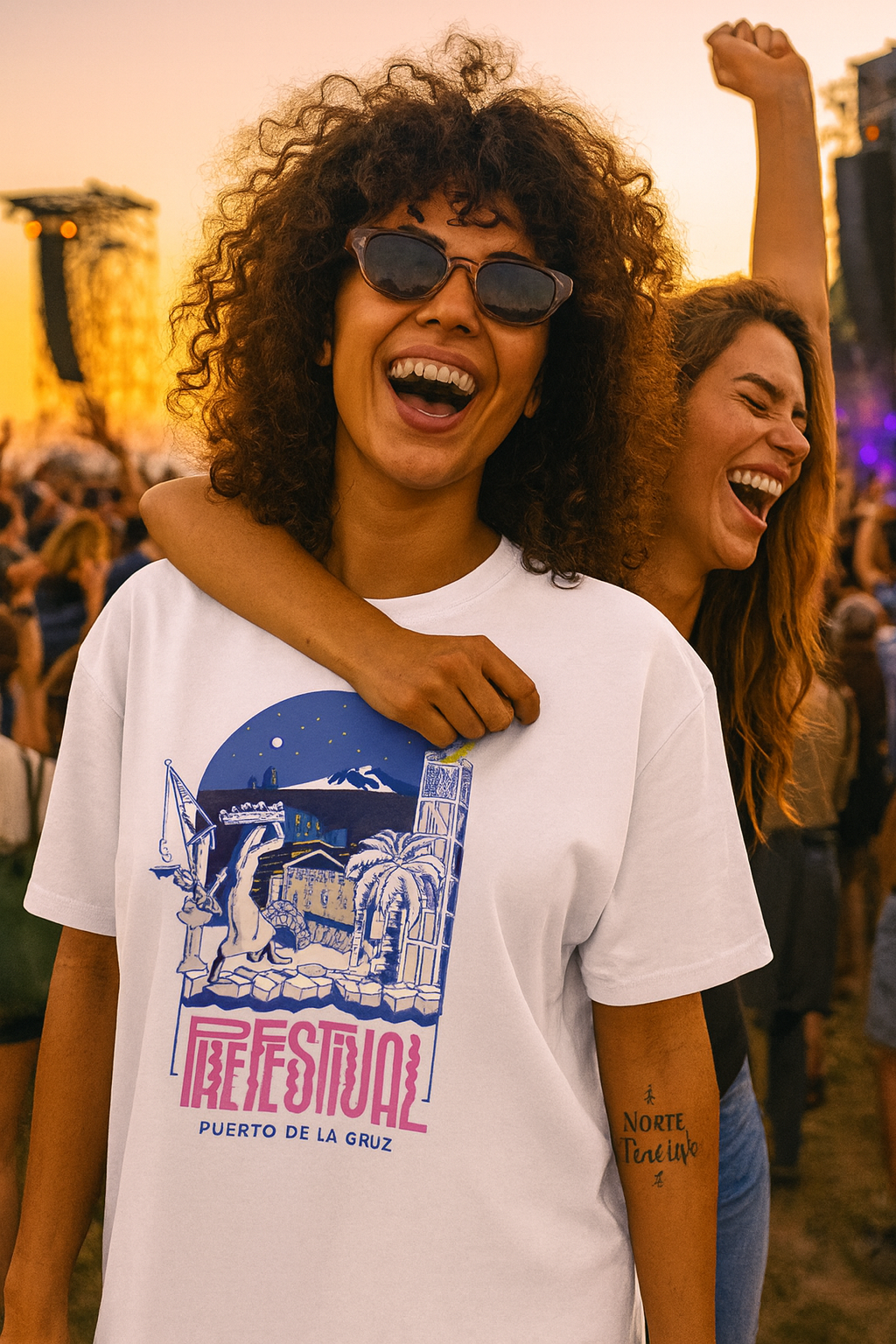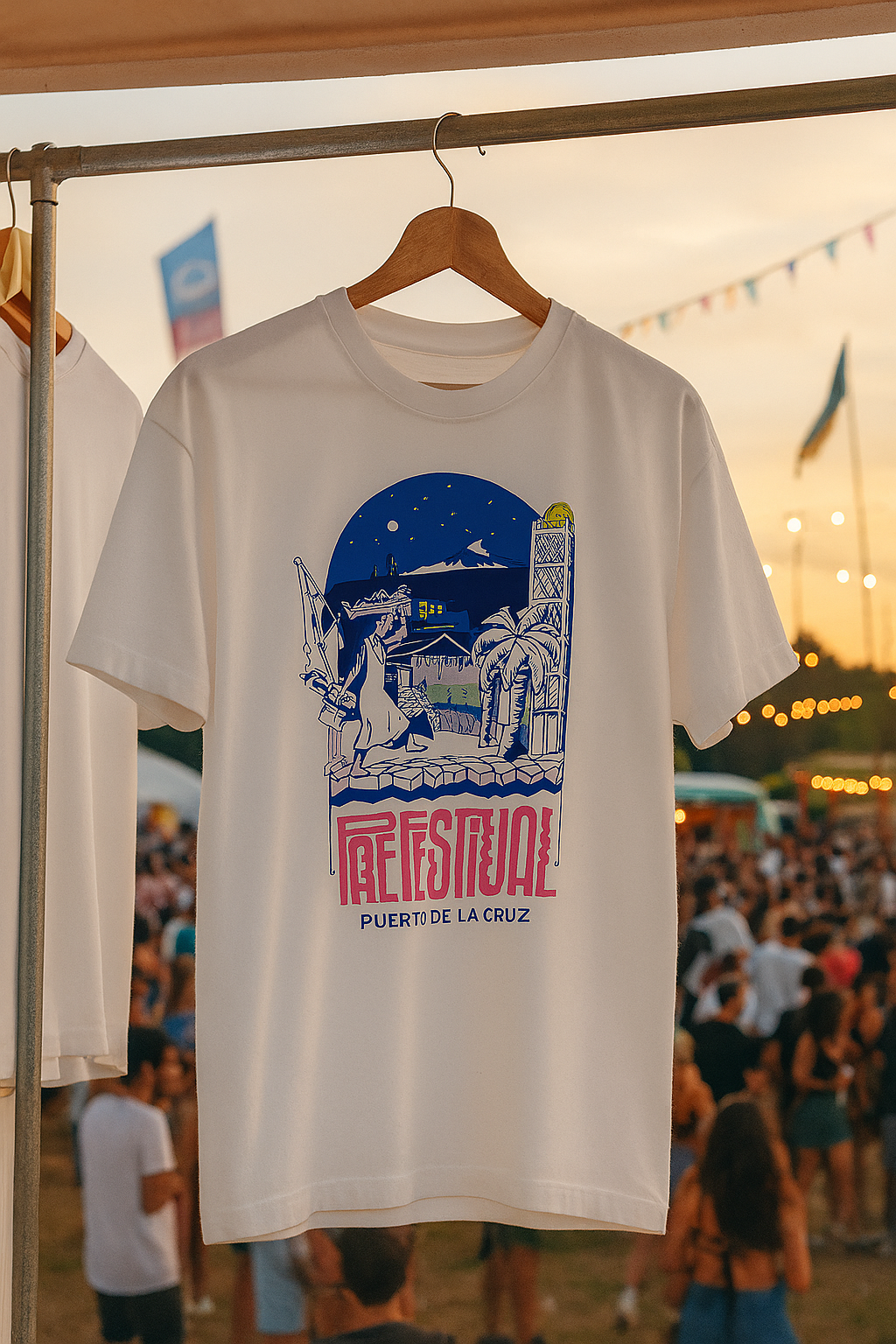 Diseño inspirado en las noches del Puerto de la Cruz: palmeras, faro, escenario y el Teide bajo la luna. Una declaración de estilo ilustrado por Rocío Salazar. La camiseta Puerto Nocturno es perfecta para quienes viven la noche con una intensidad que no le cabe en el pecho.
