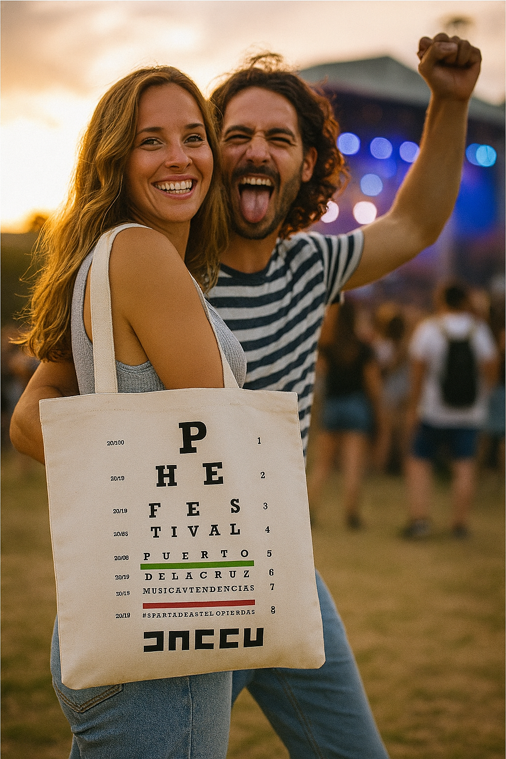 La totebag más conceptual de Phe Festival. Inspirado en un test de visión oftalmológica y la visión retrofuturista de Iván Retamas. Es el diseño recordatorio de que ver el festival con claridad y antelación es cuestión de actitud. Ligero, resistente, el foco de todas las miradas. Si parpadeas te lo pierdes.