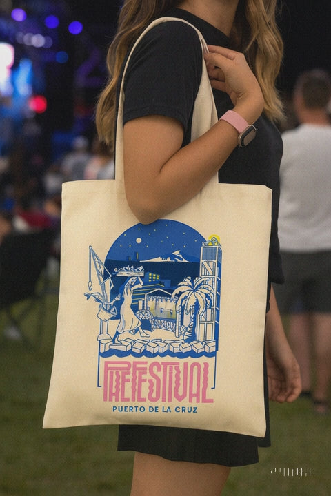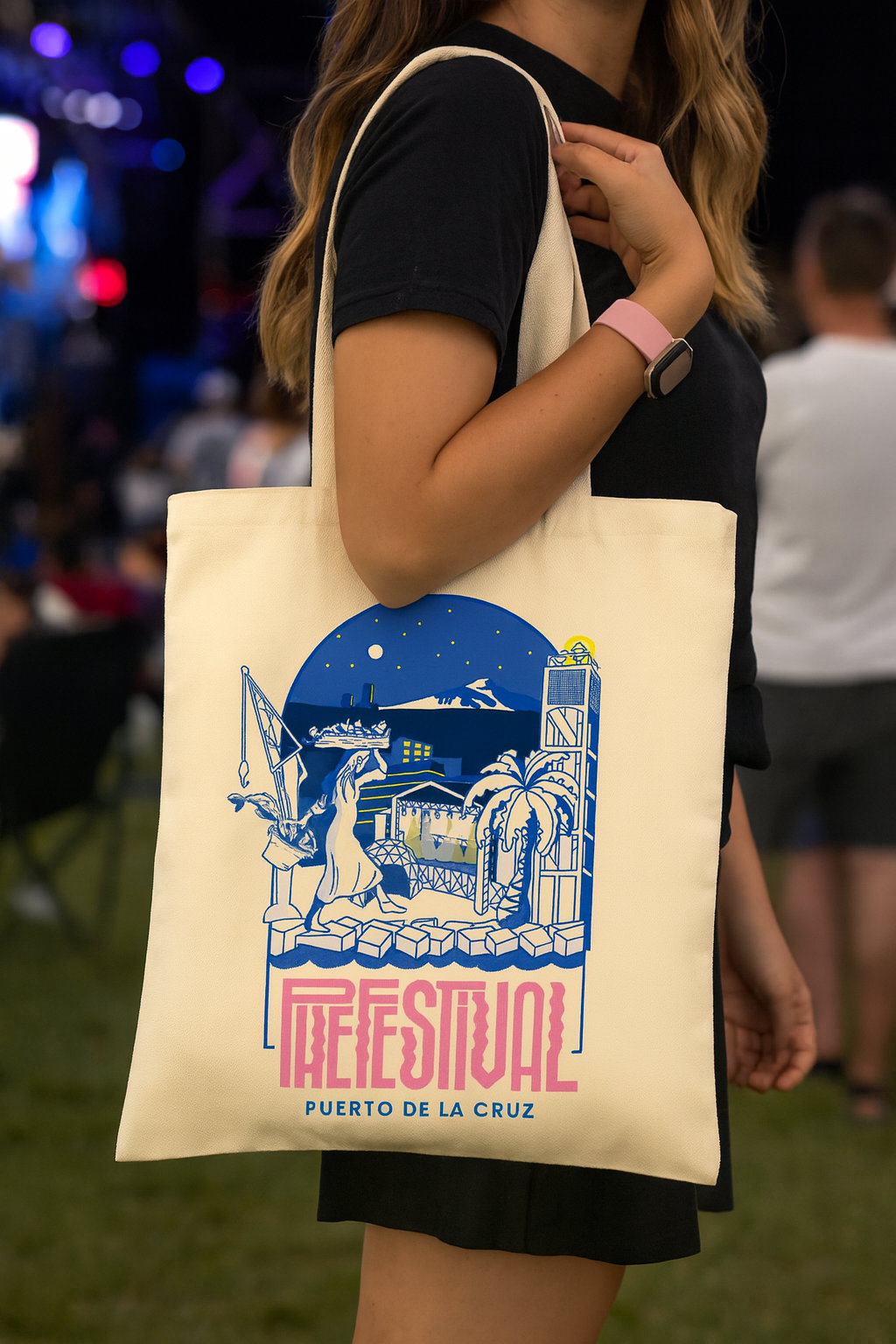 Totebag no oficial del Phe Festival 2025 adaptado el skyline marítimo terrestre desarrollado por la ilustradora Rocío Salazar. Una pieza de edición limitada que une música, arte y paisaje urbano en un diseño bastante exclusivo. Ideal para quienes, discretamente, presumen de Puerto de la Cruz.